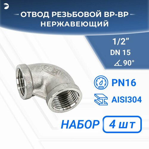 Отвод стальной резьбовой вр/вр нержавеющий, AISI304 DN ДУ 15 (1/2") дюйма, (CF8), PN16, набор 4 шт