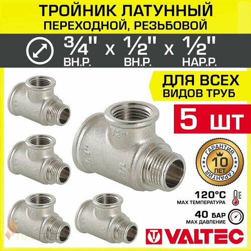5 шт - Тройник 3/4" ВР х 1/2" ВР х 1/2" НР переходной VALTEC, латунный никелированный / Трехходовой фитинг резьбовой для монтажа труб системы отопления и водоснабжения, арт. VTr.134. RN.050404