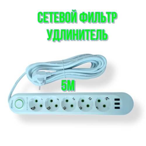 Сетевой фильтр, М, 5 розетки, 3 USB, 5 метра, 10А , QL-1073U-5M