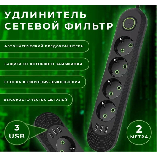Удлинитель сетевой фильтр 2 метров 4 розетки + 3 USB EU
