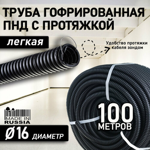 Труба гибкая гофрированная ПНД 16мм, с протяжкой, лёгкая, (100м)
