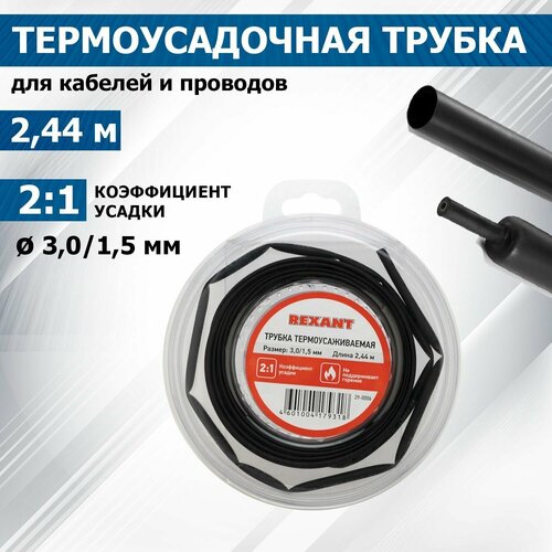 Термоусадочная черная трубка REXANT 3.0/1.5 мм для проводов, катушка 2.44 м в многоразовом боксе