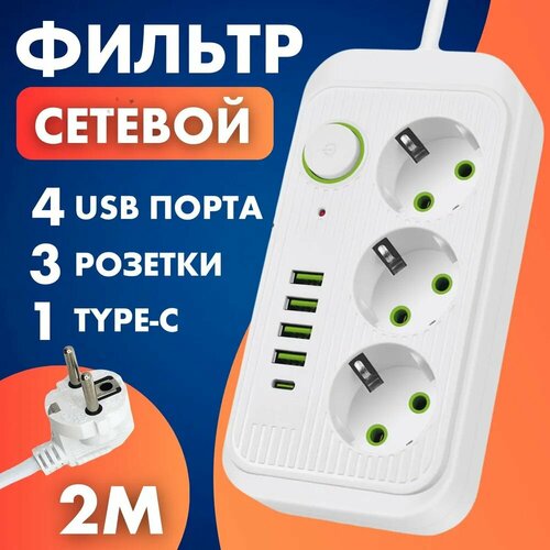 Сетевой фильтр удлинитель Power Socket, 4 USB, 3 розетки, 1 USB-C, провод 2 метра, выключатель на корпусе