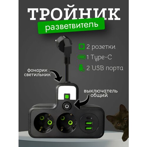 Тройник для розетки, USB, тип разветвитель, 2 розетки, 1 шт