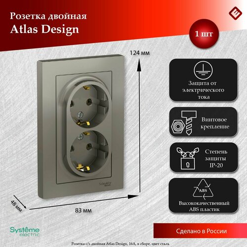 Розетка двойная сталь, с заземлением,16А, в сборе, Schneider Electric AtlasDesign