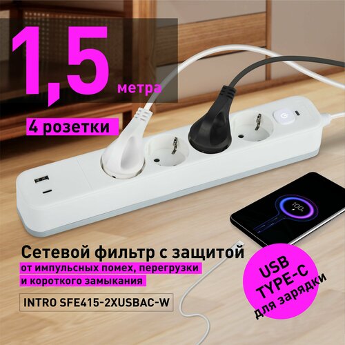 Сетевой фильтр Intro SFE415-2xUSBAC-W с базовой защитой с заземлением с выключателем 4 розетки+2xUSBA+C 3,1A 1,5м 10А