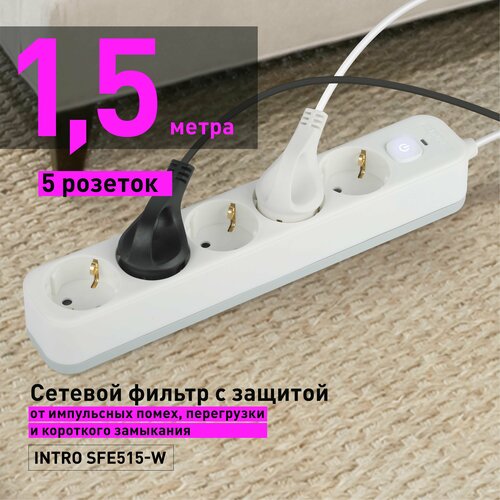 Сетевой фильтр Intro SFE515-W с базовой защитой с заземлением с выключателем 5 розеток 1,5м 10А