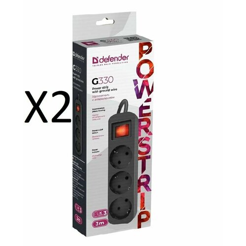 Удлинитель сетевой Defender G330, 3 розетки с заземлением , 3 метра , выключатель , комплект два удлинителя