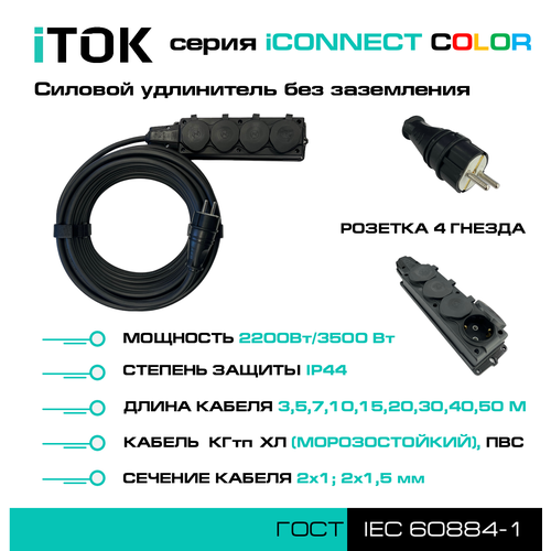 черныйСиловой удлинитель iTOK без земли серии iCONNECT предназначен для подключения различных электрических приборов, электроинструментов и устройств на напряжение до 250 В и мощностью до 3500 Вт.