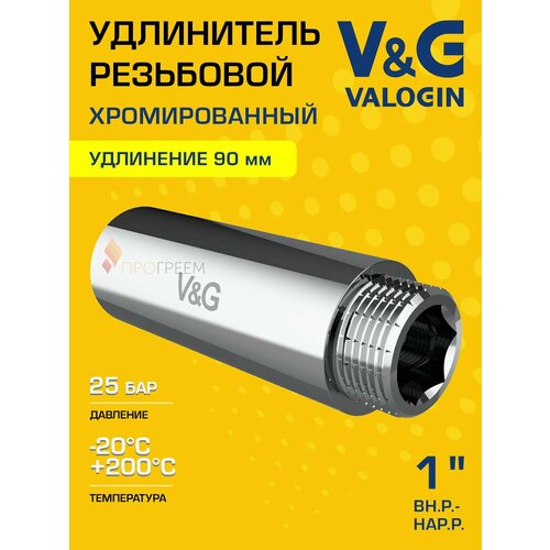 Удлинитель 1" ВР-НР х 90 мм V&G VALOGIN хромированный сантехнический / Латунный резьбовой фитинг для удлинения соединений труб ДУ25 в системе отопления и водоснабжения, арт. VG-210135