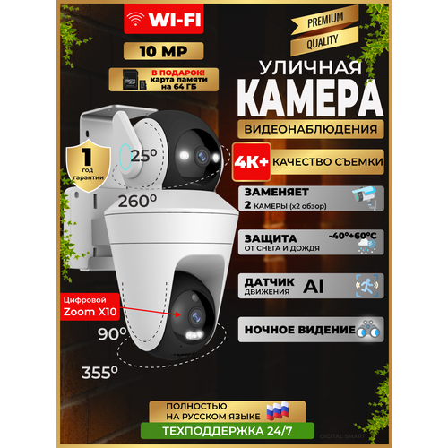 Камера видеонаблюдения уличная WiFi 10Мп, двойная, поворотная IP видеокамера с датчиком движения, режимом ночной съемки