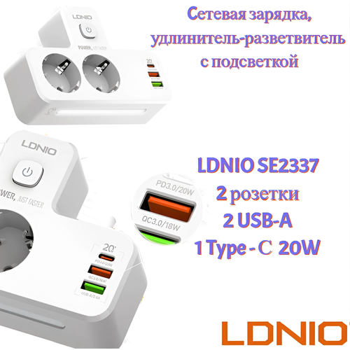 Cетевая зарядка, удлинитель-разветвитель LDNIO SE2337, 2 розетки, 2 USB-A, 1 PD 20W, EU версия