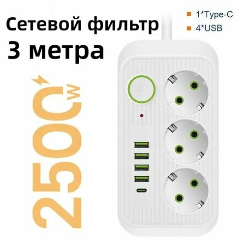Сетевой фильтр 3 метра с 3 розетками 4 USB +1 Type-C 2500 Вт (удлинитель, адаптер для зарядки, пилот, тройник), с предохранителем и заземлением
