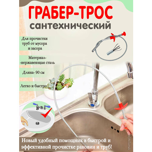 Грабер для чистки раковины 90 см/KP-704 /трос сантехнический/ для удаления засоров/серый