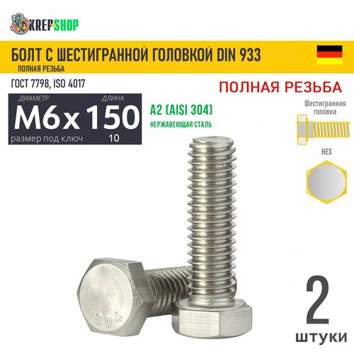 Болт шестигр. гол. M6х150 нерж. А2 DIN 933 (ГОСТ 7798), 2 шт