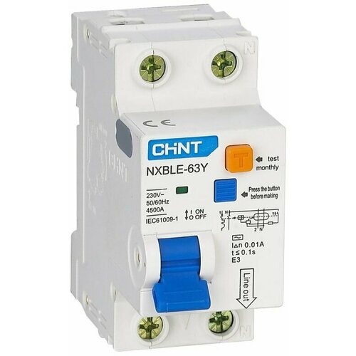 Дифференциальный автоматический выключатель CHINT NXBLE-63Y 1P+N 10А 30mA электронный тип AС, х-ка С, 4.5kA