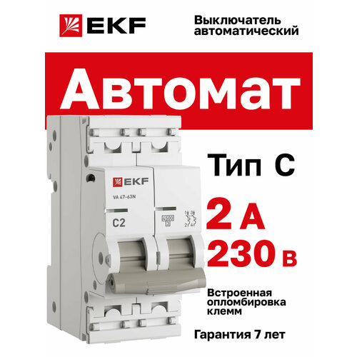 Автомат 2А, тип C, двухполюсный 2P, 4,5kA, cо встроенной опломбировкой клемм EKF PROXIMA ВА 47-63N (Автоматический выключатель C2)