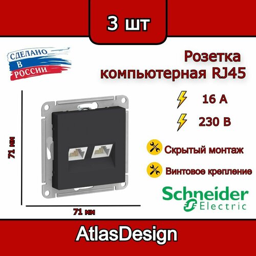 Розетка двойная компьютерная RJ45, карбон, Schneider Electric AtlasDesign (комплект 3шт)
