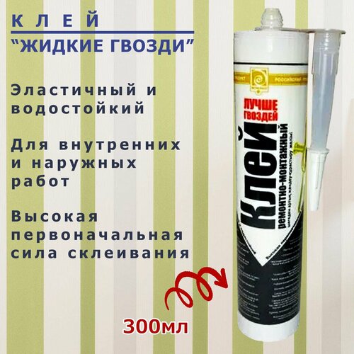 бесцветныйЖидкие гвозди «Quality» экспресс – профессиональный строительный клей – современная альтернатива привычным металлическим гвоздям, шурупам и дюбелям. Назначение: для приклеивания изделий из пенополистирола, стеновых панелей, пробки, дерева / доски, кафельной плитки, ДСП, МДФ, металла, гипса, кирпича, гипсокартона, цемента, декоративного камня, пр. Состав: поливинилацетатные полимеры, наполнитель. Цвет: прозрачный Свойства: • время первоначального схватывания 15 минут • сила схватывания 90 кг/кв. м. • расход – 15 м (при нанесении сплошным слоем при диаметре среза носика 6 мм), температура применения от -10 до +30 °С • рекомендуемая — не ниже +15°С. • морозоустойчивость – допустимо замораживание без потери клеящих свойств Указание по применению: 1. Склеиваемые поверхности должны быть сухими, чистыми, обезжиренными, хотя бы одна из поверхностей должна обладать способностью впитывания. 2. Клей наносится на одну из склеиваемых поверхностей либо сплошной полосой, либо точечно. 3. Склеиваемые поверхности силь