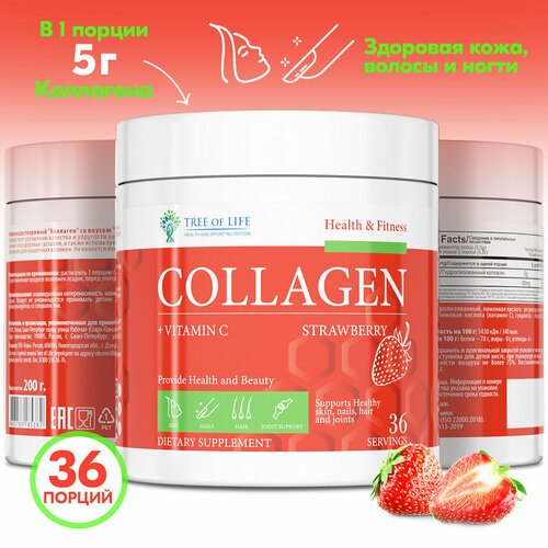 Коллаген порошок с витамином С Collagen + Vitamin С Добавка БАД для здоровья кожи, волос, суставов и связок, спортивный колаген мужчинам и женщинам, спорт пептид со вкусом Клубники, 36п