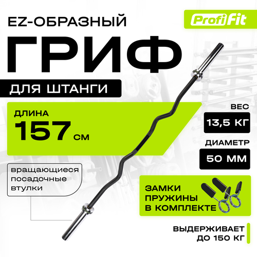 Гриф для штанги EZ-образный, строгий, соревновательный (до 150 кг, замки-пружины) D50 мм PROFI-FIT