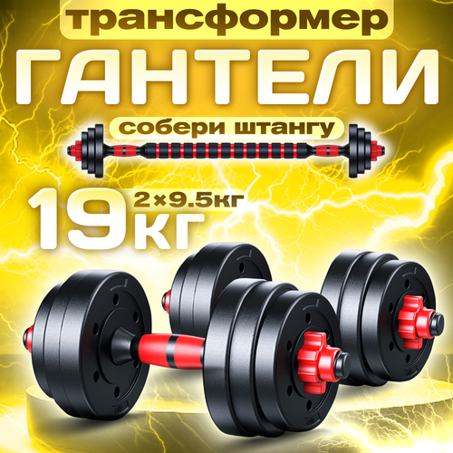 Гантели разборные титан для фитнеса + переходник на штангу спортивную, общий вес 19 кг, 2 шт. по 9.5 кг