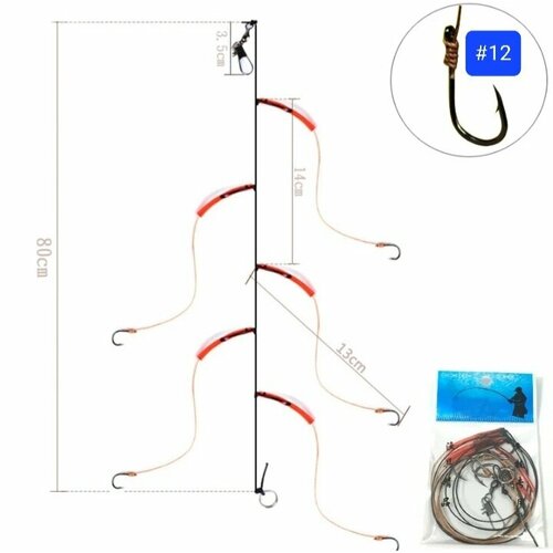 Монтаж рыболовный, снасть на карпа сазана, 5 крючков из высокоуглеродистой стали с поводками на леске (номер 12)