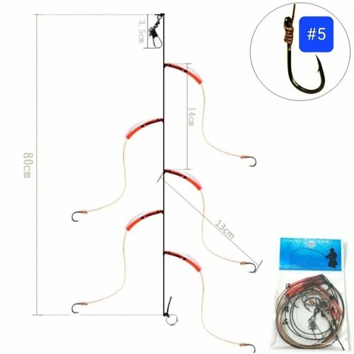 Монтаж рыболовный, снасть на карпа сазана, 5 крючков из высокоуглеродистой стали с поводками на леске (номер 5)