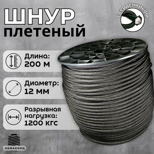 Веревка туристическая 12 мм 200 м черная. Шнур полипропиленовый плетеный с сердечником