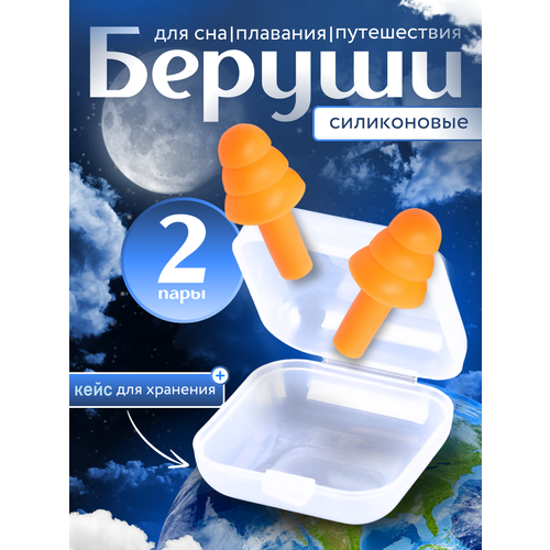 Многоразовые беруши для сна и плавания - силиконовые, 4 шт + 2 футляра в подарок/Цвет- оранжевый