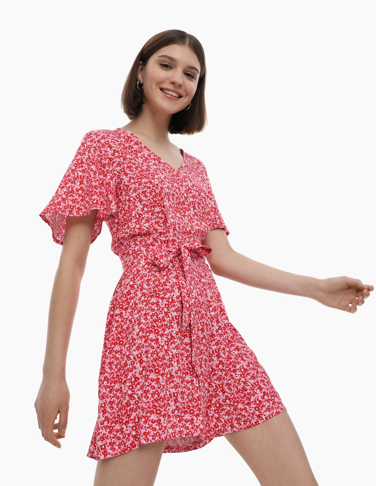 Детали: приталенный силуэт, короткий рукав, пуговицы, отложной воротник, шлёвки, прорезные карманы., пояс.