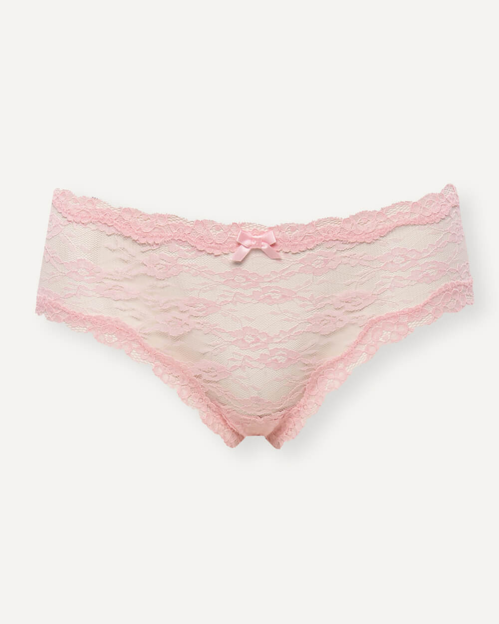 трусыЗеленые трусы-шорты из прозрачного эластичного кружева с флористическим узором. Линия низа и поясок отделаны фестончатой тесьмой в тон.