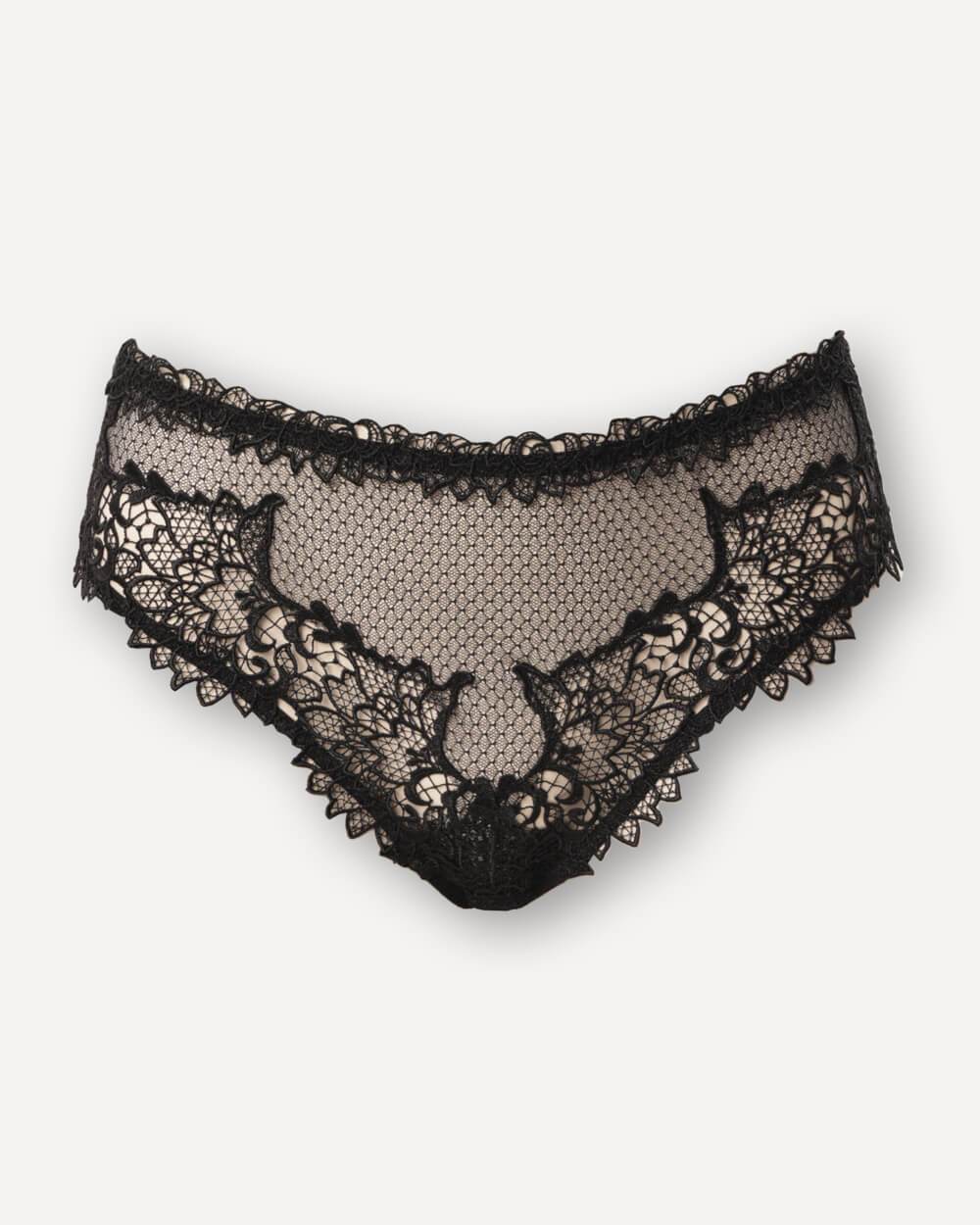 черныйТрусы-бикини черного цвета выполнены из кружева с комбинированным рисунком — с растительными мотивами и тонким мелким узором. По низу и на линии пояска ажурная отделка.